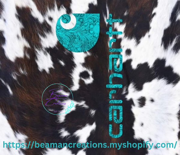 Teal Carhartt logo on cowhide background.