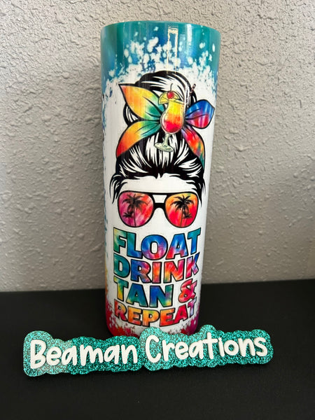 Float Tan Drink Repeat tumbler with messy bun girl. Tie-dye background with palm trees